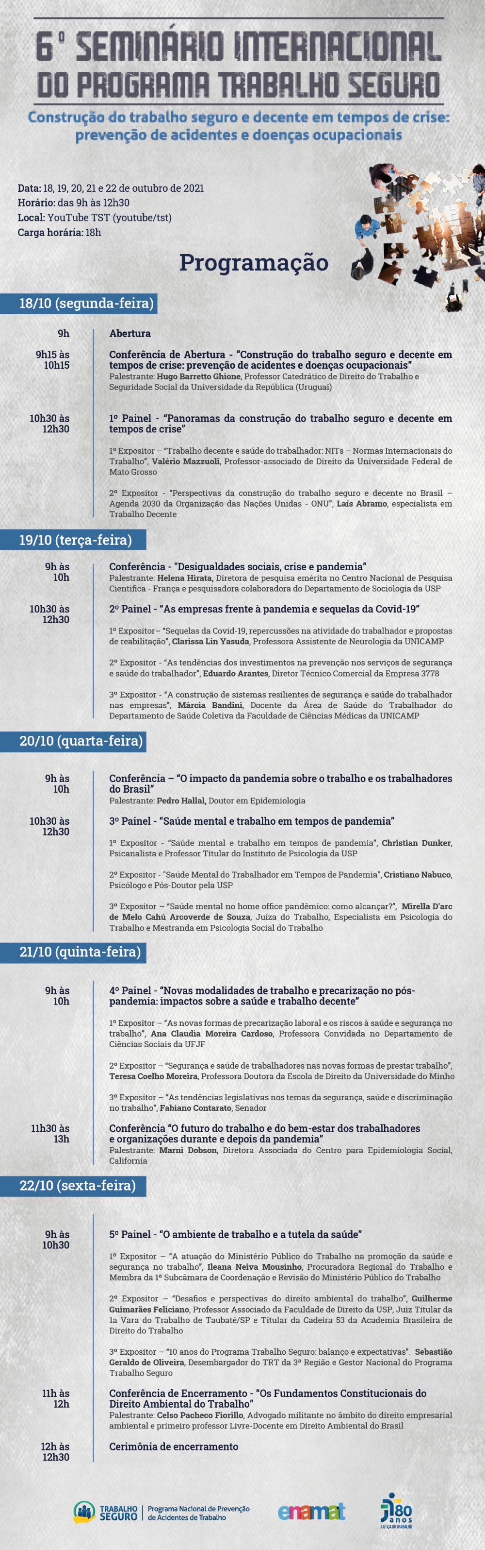 Os interessados em participar do “6º Seminário Internacional do Programa Trabalho Seguro - Construção do trabalho seguro e decente em tempos de crise: prevenção de acidentes e doenças ocupacionais” já podem se inscrever a partir desta segunda-feira (27/9). O evento é promovido pelo Programa Nacional de Prevenção de Acidentes de Trabalho da Justiça do Trabalho, com o apoio da Escola Nacional de Formação e Aperfeiçoamento de Magistrados do Trabalho (Enamat). O evento, que será realizado entre os dias 18 e 22 de outubro, será transmitido ao vivo pelo canal oficial do TST no YouTube.